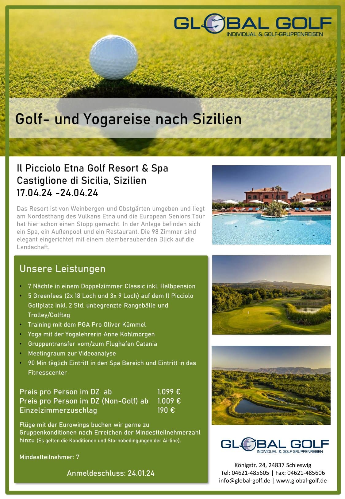 Golf-Gruppenreise und Yogareise mit Pro und Yogalehrerin nach Sizilien in das Il Picciolo Etna Golf Resort & Spa Castiglione di Sicilia, Italien, vom 17.04.24 bis 24.04.24